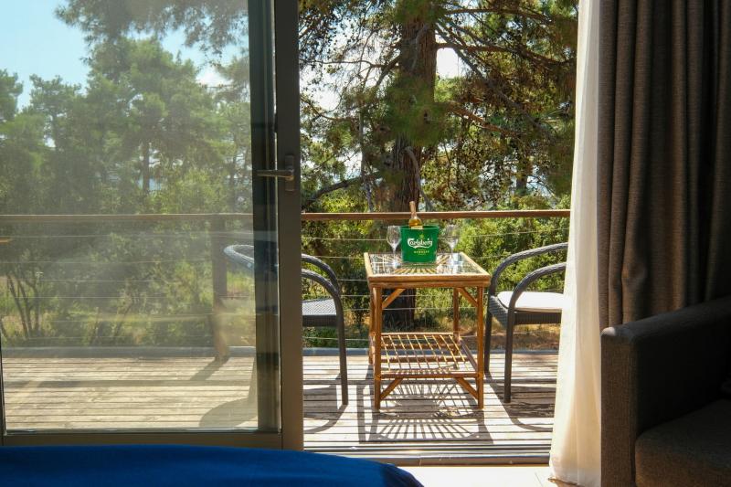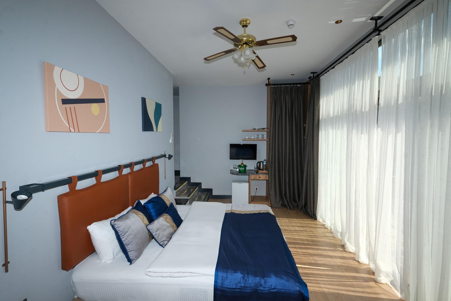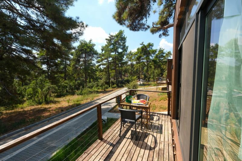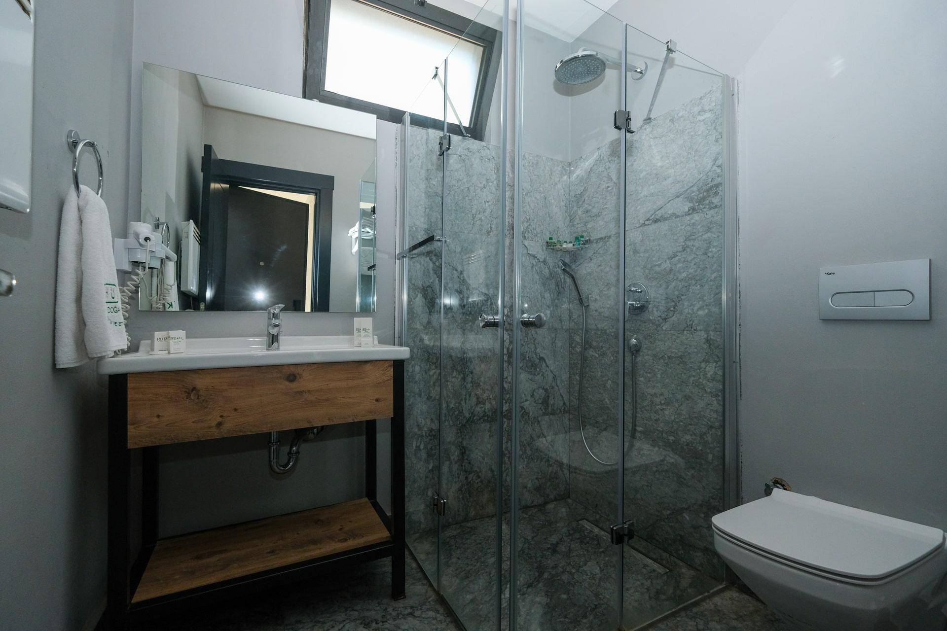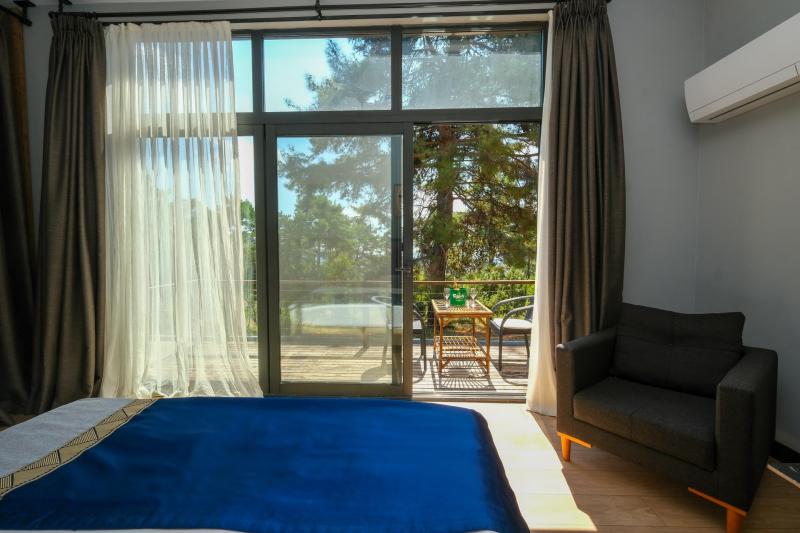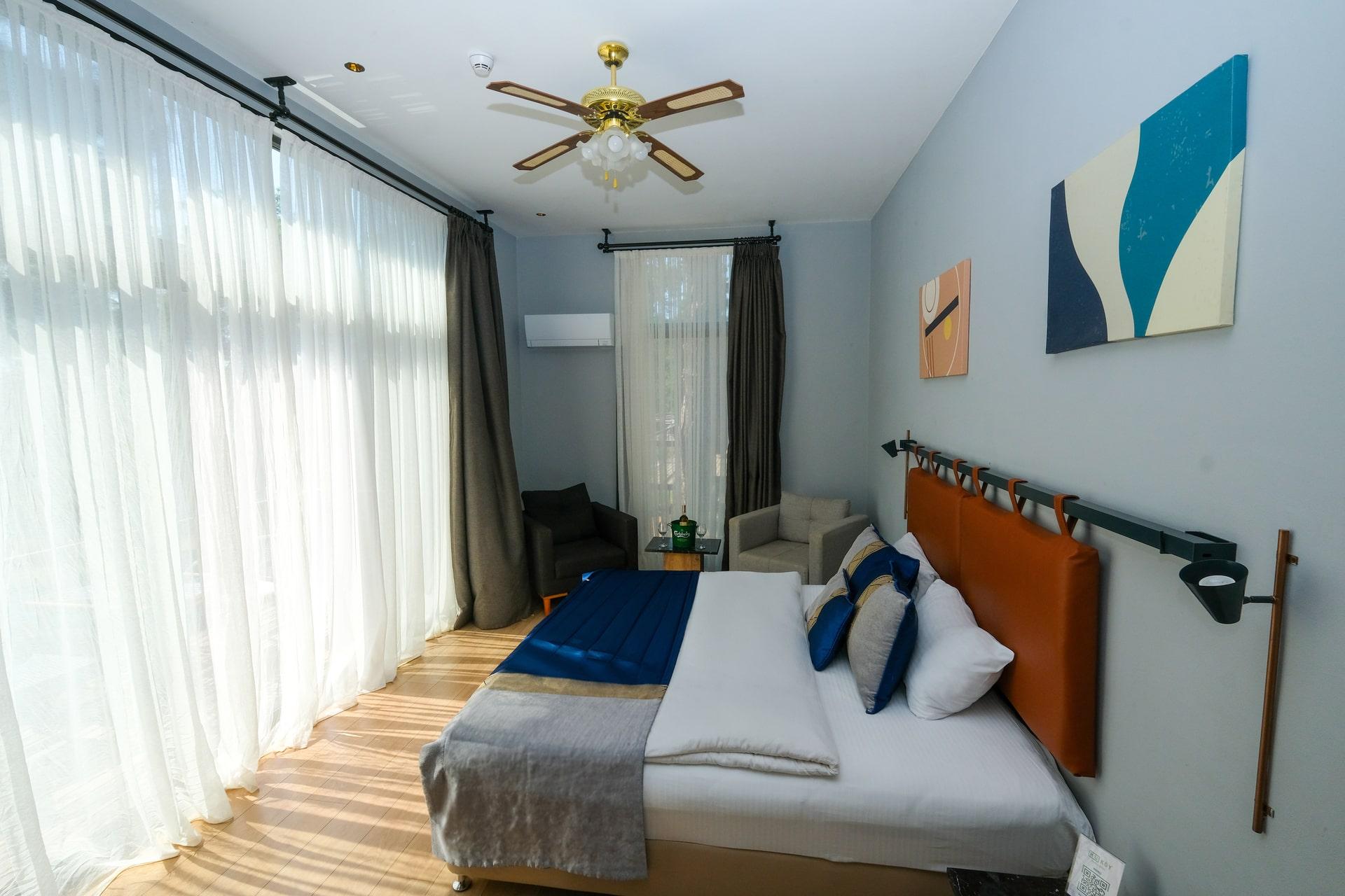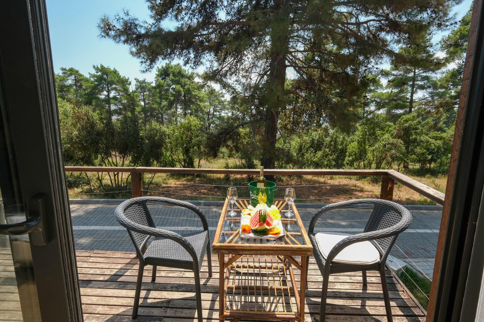 1 Adet Çift kişilik yatak, 2 Tekli Berjer, Doğal Ahşap Zemin, Duşa Kabin, Veranda, Çelik Kasa, Klima, Mini Bar, WC, Çay & Kahve Seti, Saç Kurutma Makinası, Kişisel Bakım Seti, Terlik, Hatlı Telefon, Wi-Fi, LCD LED Uydu televizyon